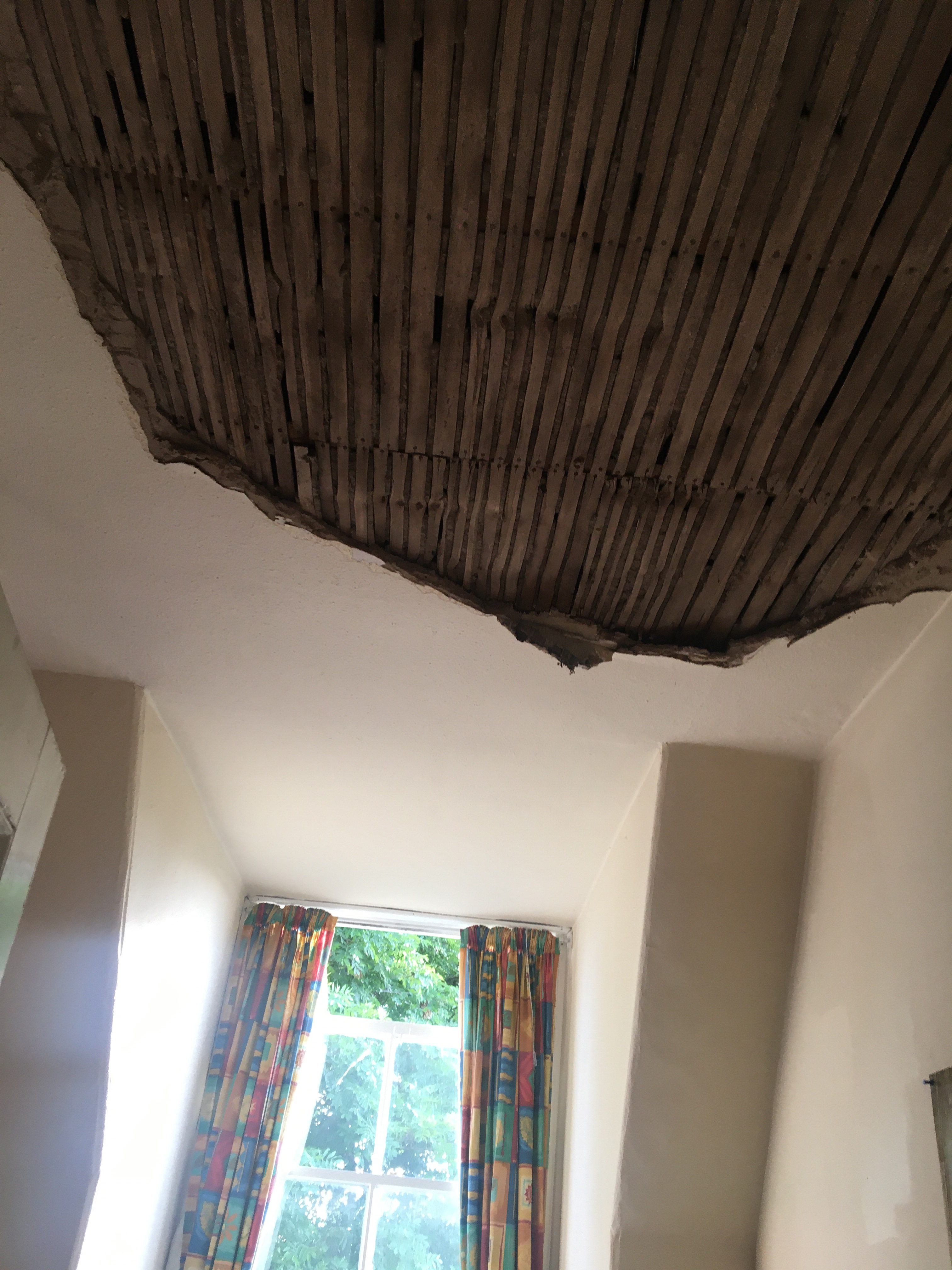 What a shock I got! I was standing over by the desk in the window of my husband’s study when suddenly I heard an almighty crash behind me. Almost a third of the ceiling had fallen; the floor was covered with plaster, dust and stour filling the air. I hadn’t noticed any cracks or sagging prior to this. I’m just so thankful it didn’t land on my head.