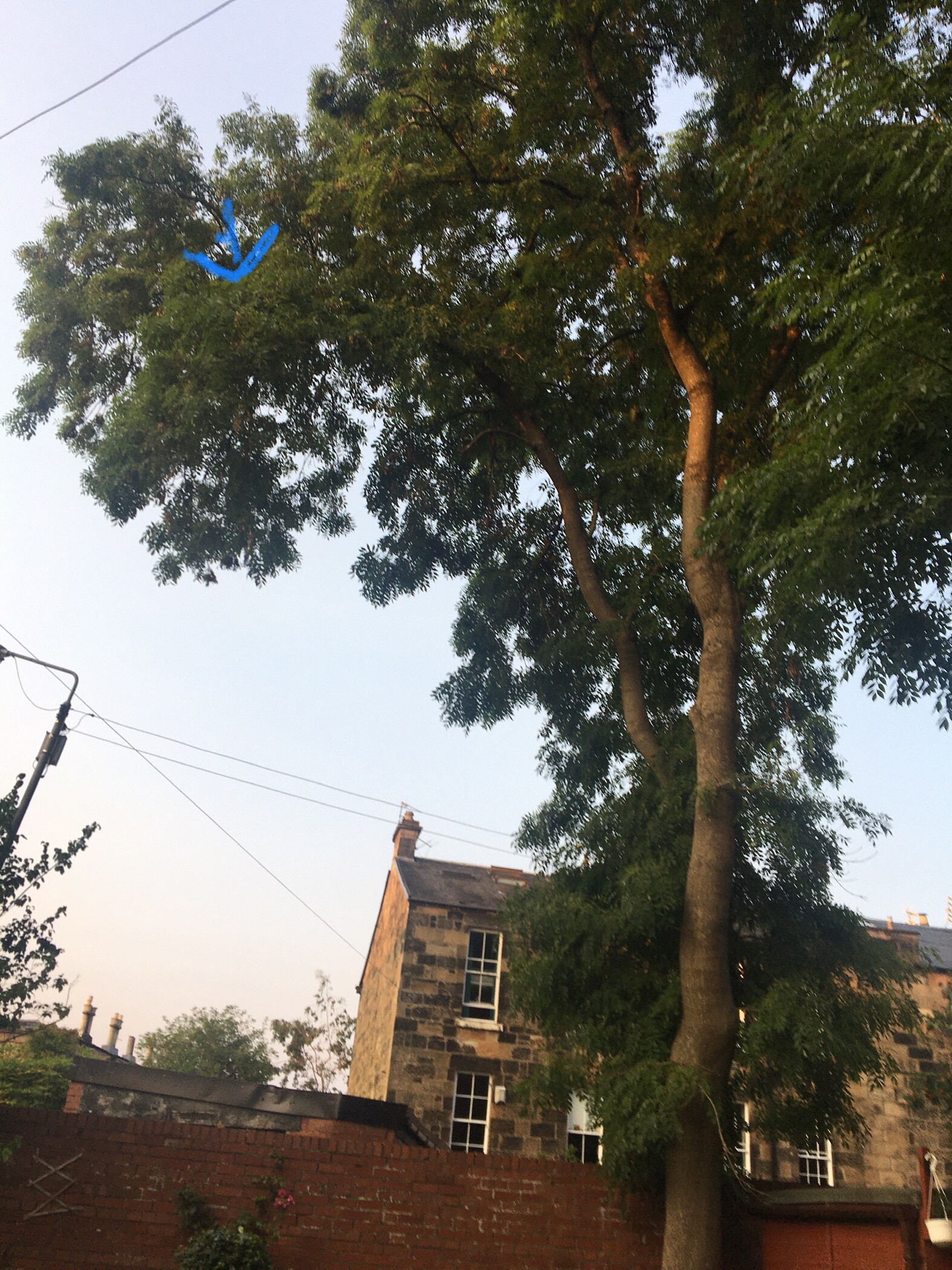 Our faithful neighbour friends gathered in our garden calling and coaxing. We used binoculars to see her; she was so high and often hidden by foliage. We spread duvets underneath, and coaxed some more. The steep downward climb seemed too hard for her, and for three hours she would approach the trunk, mew like crazy, then go back along the branch.